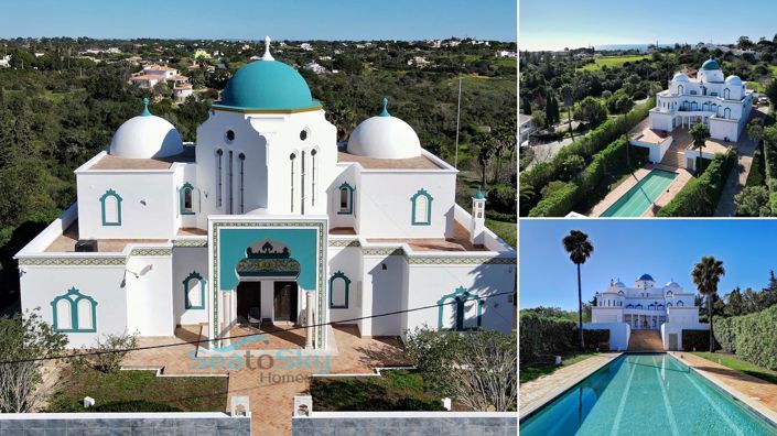 This impressive 5-bedroom home is located at the end of a peaceful road, just two kilometres from the beach and a short drive into the popular seaside village of Carvoeiro. Influenced by the Moorish history of the Algarve, this spacious home has many beautiful decorative features including domed ceilings and intricate tile murals, and boasts many luxuries such as 20m pool, sauna, Turkish bath, wine cellar, bar, gym, childrens play area, jogging path and even a football pitch.